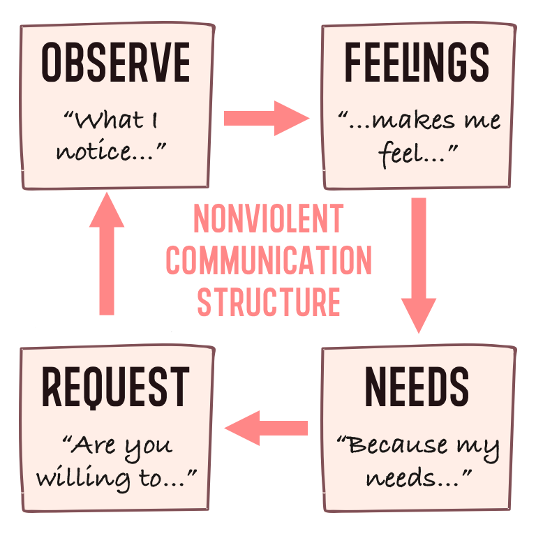 Nonviolent communication (NVC) hay giao tiếp phi bạo lực là một hình thức trao đổi bằng ngôn từ mà trong đó, bạn sẽ chia sẻ sự đồng cảm của mình với người khác. Giao tiếp phi bạo lực bao gồm bốn bước cơ bản: Quan sát – Cảm nhận – Nhu cầu – Yêu cầu.